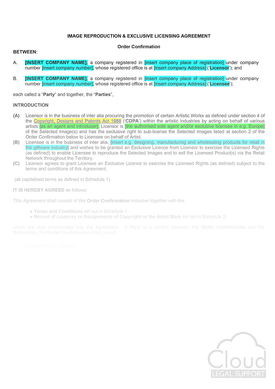 This agreement is used when a business (Licensor) acting as e.g. an agent on behalf of the owner of one or more artistic works (e.g. painting or photographs or sculpture) etc (the ‘Licensed Images’) agrees to grant certain Licensed Rights in respect of the Licensed Images to the Licensee (in law this is called granting a license, a license is essentially a permission) to enable the Licensee to e.g. reproduce the Licensed Images to create new Licensed Products which they can then sell. In this Agreement, the licence granted is ‘exclusive’ and limited to sale throughout the “Retail Network” (as defined) and the “Territory” (as defined). The licence could be restricted to be a non-exclusive one with some further tailoring.